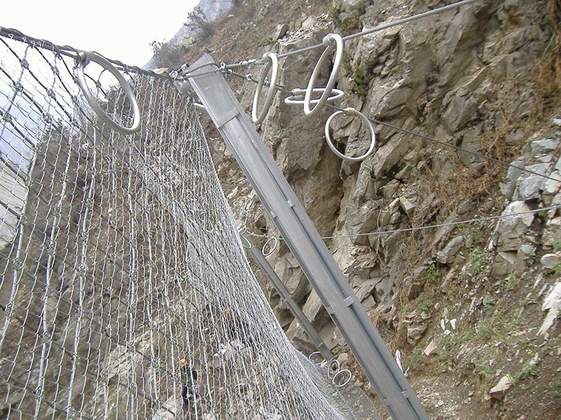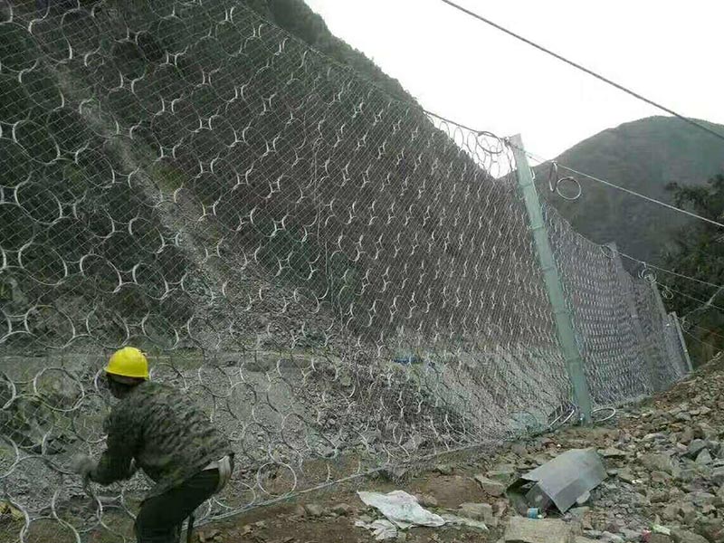 SNS被動防護網SNS被動防護網由鋼絲繩網或環形網(需攔截小塊落石時附加一層鐵絲格柵),固定系統(錨桿、攔錨繩、基座和支撐繩)、減壓環和鋼柱四個主要部分構成。鋼柱和鋼絲繩網連接組合構成一個整體,對所防護的區域形成面防護,從而阻止崩塌巖石土體的下墜,起到邊坡防護作用。